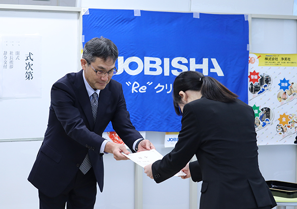 社長の挨拶では「浄美社はビルメンテナンス以外にも事業を行っており、大阪や愛知、東京など様々な場所に支店を持っています。会社を通じていろんな場所に行き、いろんな人と出会って話す。それが成長に繋がったら、社長として嬉しい限りです。